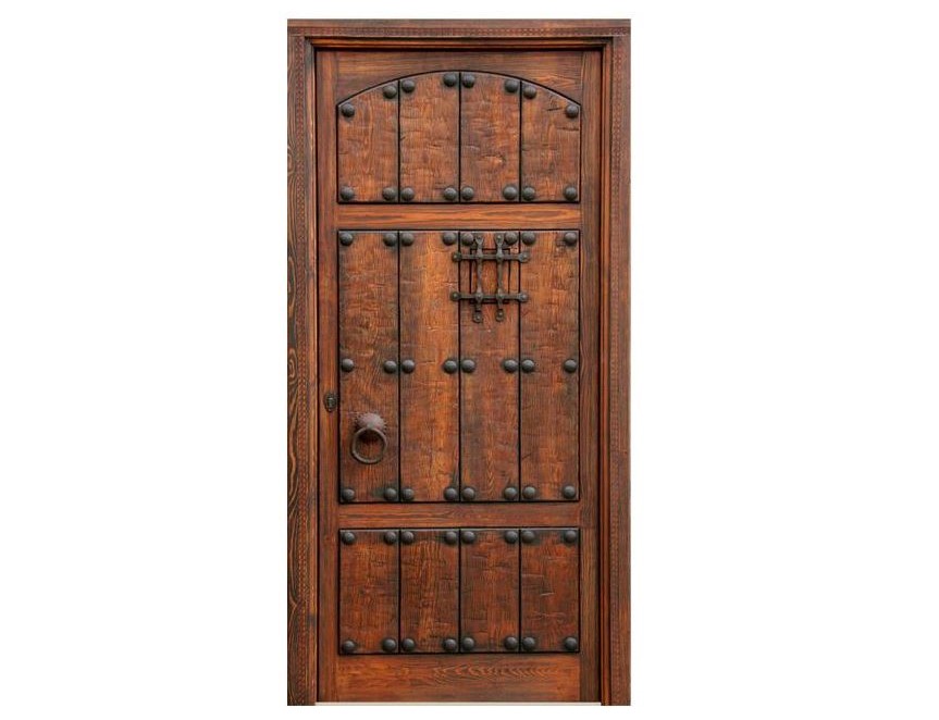 Puerta de madera maciza con cerco de madera, con armazón entrevistado con un espesor de 4,5 cm, solapado por una base exterior de tabla maciza de pino rojo de un grosor de 2,8 cm dando un total a la hoja de 7,3 cm de espesor.