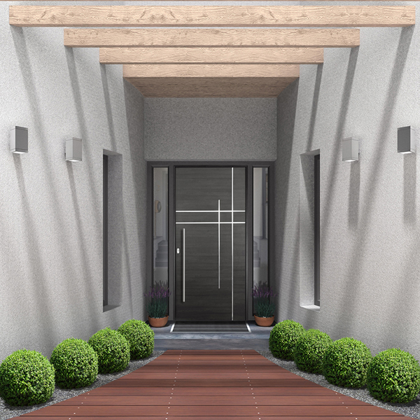 Puerta de entrada moderna con decoración exterior en aluminio efecto madera o lacado en cualquier color de la carta Ral, con incrustaciones decorativas en acero inoxidable o fresados.