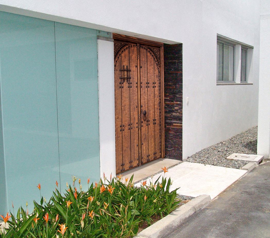 Puerta de madera maciza con cerco de madera, con armazón entrevistado con un espesor de 4,5 cm, solapado por una base exterior de tabla maciza de pino rojo de un grosor de 2,8 cm dando un total a la hoja de 7,3 cm de espesor.