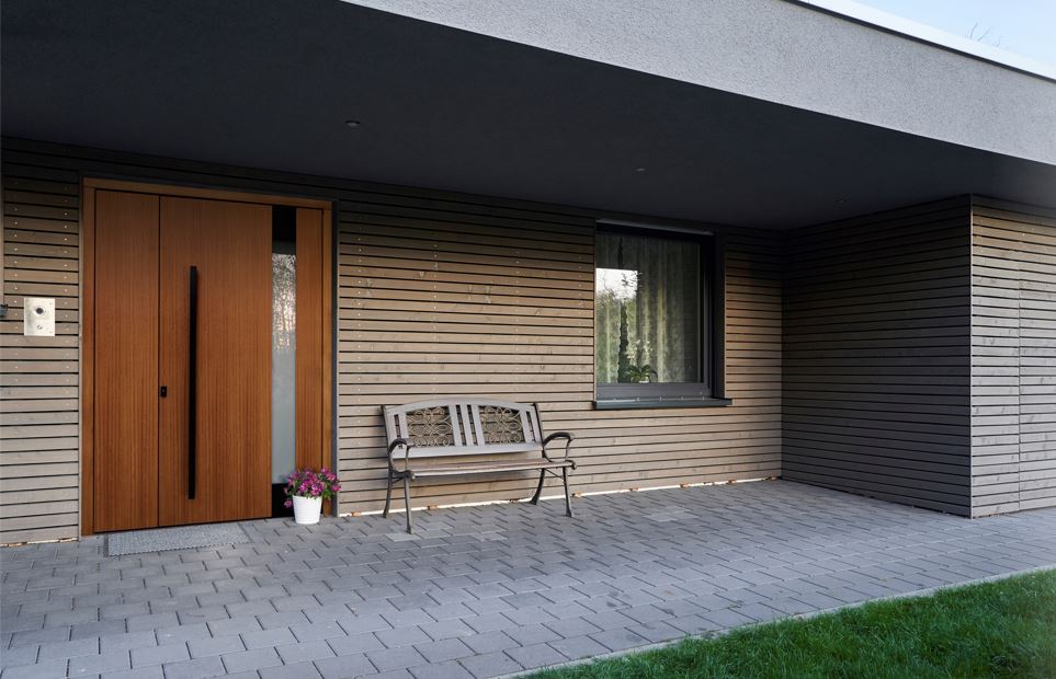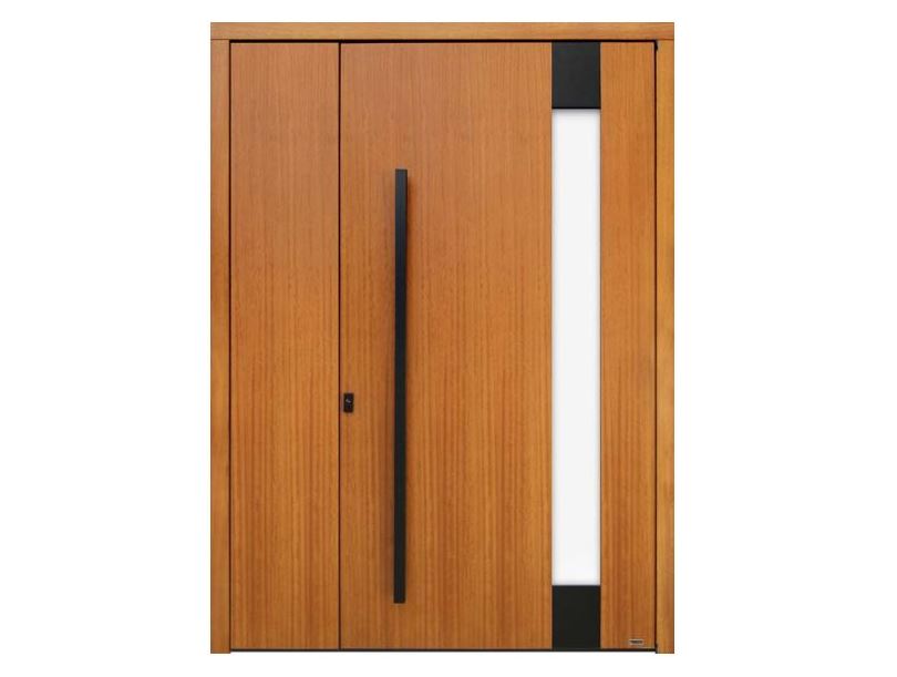 Puerta de entrada moderna con decoración exterior en madera natural (fenólico), aluminio efecto madera o posibilidad de lacarlo en cualquier color de la carta de RAL y con opción de incluir el vidrio P6B de seguridad en hoja.
